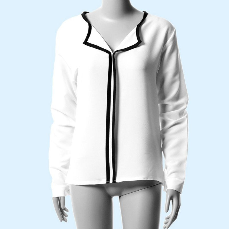 New Style Fashion Womens Casual White Shirt Long Sleeve Black Side Chiffon Blouse V-neck Work Shirts Women NW
