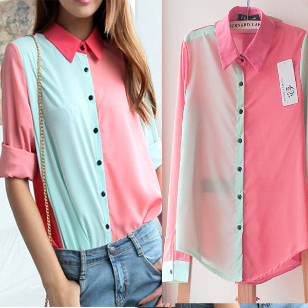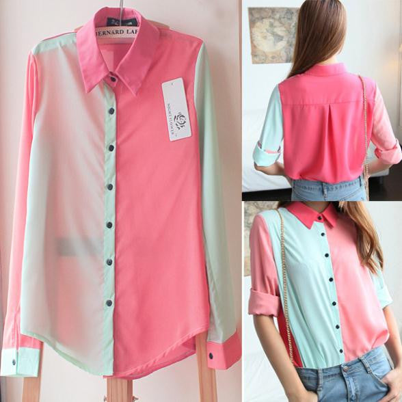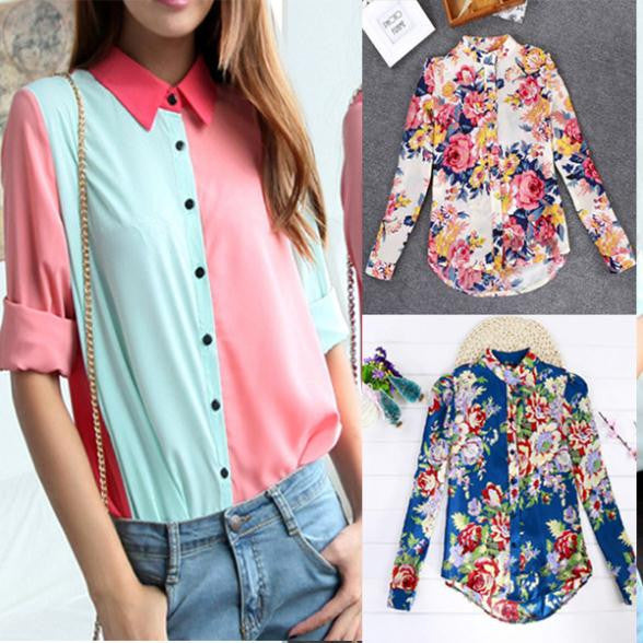 Women Chiffon Floral Print Lapel Shirt Long Sleeve Loose Tops Blouse NW